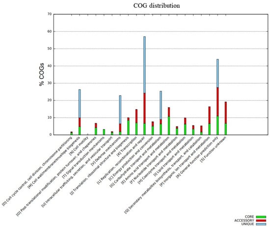 Function annotation using the BPGA pipeline in which the bar graph represents the COG classifications of the pangenome. The core genome is represented by the green color, the accessory genome is represented by the red color, and unique genes are represented by the blue color.