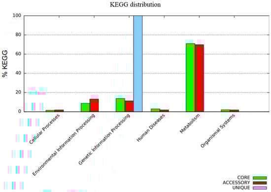 Functional annotation using the BPGA pipeline in which the bar graph represents the KEGG classifications of the pangenome. The core genome is represented by the green color, the accessory genome is represented by the red color, and unique genes are represented by the blue color.