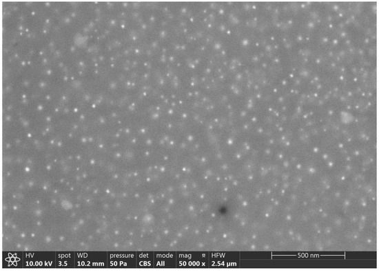 To study the presence and distribution of silver particles in the vitreous matrix, a SEM micrograph was taken at 50,000 magnifications and 10 kV, observing a high amount of silver nanoparticles inside the glassy matrix of approximately 10–20 nanometers (Figure 2).
