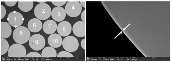 For the study of the coating thickness of the silver-coated glass beads, ten beads were chosen, and a micrograph in cross section was taken under the stereo-microscope. Then, the same image was observed in the SEM (Figure 3). Due to the heterogeneity of the coating on the surface of the bead, thickness measurements were performed in four areas of each of the beads (small white points in Figure 3).
