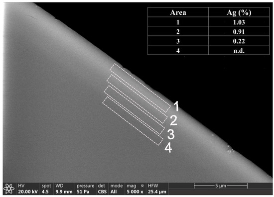 Silver-coated beads were observed under the stereo-microscope after the lixiviation test. The study of beads in both the stereo-microscope and SEM was carried out in cross-section. For this purpose, first a photograph was taken under the stereo-microscope, and then the same image was observed in the SEM (Figure 4). The golden color of the beads after the leaching process showed the presence of silver in the glassy matrix. Therefore, it was decided to carry out an EDS analysis on the surface of the beads at different areas (A1–A4), showing a silver content of up to 1% of silver in the most superficial area (A1), which decreased towards the center of the bead where silver was no longer detected (Figure 5).