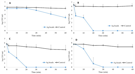 Antimicrobial activity was evaluated at different exposure timepoints (0, 10, 20, 30, 45, and 60 min) by quantifying the reduction in the microbial population after exposing a known microbial population to 20 g of silver-coated glass beads contained in a total volume of 100 mL of sterile water (see Section 2). Figure 6 shows the results for the four microbial species tested in this study as the Log10 of CFU/mL for each time and experimental condition.