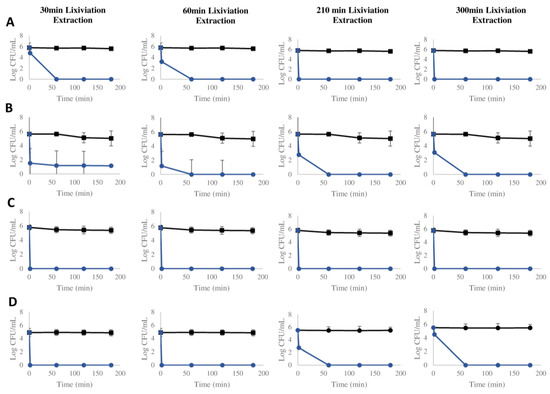 Antimicrobial activity of lixiviation extractions against a known microbial population of S. aureus ATCC 29213 (A), E. coli CECT 101 (B), P. aeruginosa ATCC 27853 (C), and C. auris CJ 207 (D). Experimental condition comparing the effect of silver-coated glass beads (blue line) and positive control (no beads) (black line).