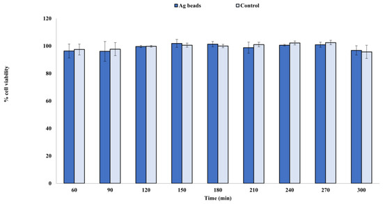 For each extraction, a value of cell viability percentage was obtained and represented in Figure 8. According to the collected data, cell viability was above 95% 48 h post-treatment for all tested extractions. Therefore, no cytotoxic effect was observed from the silver ions released from the silver-coated glass beads.