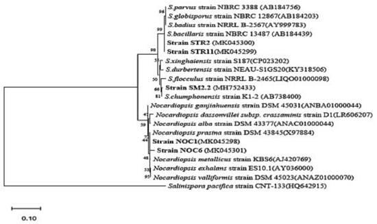 Maximum likelihood phylogenetic tree based on 16S rRNA gene sequences showing the relationship of strains SM2.2, STR2, STR11, NOC1, and NOC6 with other genus Streptomyces and Nocardiopsis species. Bootstrap values are expressed as percentages of 1000 replicates. The 16SrRNA gene sequence of Salinispora pacifica CNT-133 (HQ642915) was used as the outgroup. Bar, 0.1 substitutions per nucleotide position.