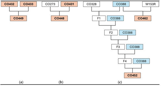 Summary of the pedigrees of the host maize genotypes used in this study. The seeds were obtained from the Agriculture and Agri-Food Canada breeding program (Ottawa Research and Development Centre, Canada). The red text indicates the parents in pedigree relationships between genotypes. CO462 and CO452 share a parent. CO431 is a parent in the pedigree for CO448. CO432 and CO433 are parents in the pedigree for CO449. The heterotic groups are color-coded to highlight genotypes that share common ancestry. The figure was adapted from Thompson et al., 2023 and Khalaf et al., 2021 with additional notes [4,16,19,20,21].
