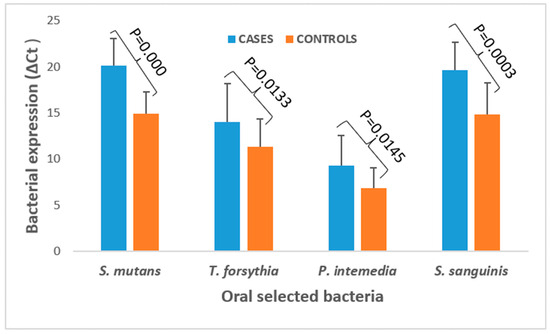 Figure 1 illustrates the distribution of S. mutans, S. sanguinis, P. intermedia, and T. forsythia bacteria and their bacterial load in the saliva of patients with ESCC and healthy controls in Mthatha, South Africa. The analysis of the figure revealed the presence of these bacteria in both groups, but the bacterial load was significantly higher in the patients with ESCC than in the healthy controls. The results also showed a significantly higher abundance of bacteria in the ESCC group than healthy controls. However, their expression levels were significantly higher in patients with ESCC, with p-values below 0.05 in all cases, underlining the significant association between these bacteria and ESCC.
