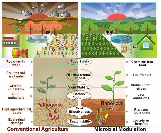 An overview of microbial modulation or manipulation techniques in sustainable agriculture practices. This figure illustrates the contrasting ecological impacts of microbial manipulation/modulation versus conventional cropping on various environmental components such as soil, air, and water. Microbial modulation promotes eco-friendly practices, enhances soil health, and reduces pollution in air and water. It supports long-term sustainability, stable yields under stress, and chemical-free food production. In contrast, conventional cropping contributes to soil degradation, water contamination, and air pollution, with high emissions, pesticide residues, and vulnerability to climate change, while relying on costly and harmful agrochemical inputs.