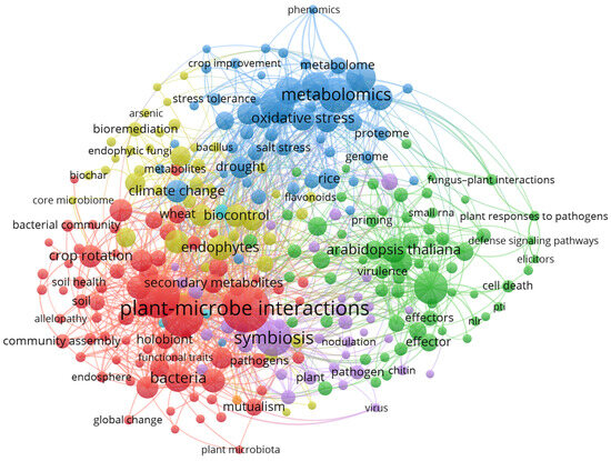 Network visualization map displaying the key term present in the title and abstract of the published article related to the plant–microbe interactions in abiotic stress management. Nodes of the same color show a cluster of the interconnected phrases; however, the circle size indicates the number of publications, with the larger size indicating a large number of publications. The network has been created using the software VOS viewer processing software (v1.6.9.).