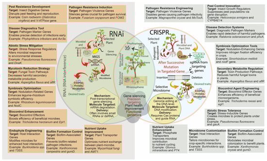 The interplay between RNAi and CRISPR technologies in plant–microbe interactions, emphasizing their distinct and overlapping roles in microbiome engineering. RNAi (Left Circle) is a post-transcriptional gene-silencing mechanism targeting mRNA degradation, widely used for pest control (e.g., silencing digestive genes in Corn rootworm) and mycotoxin reduction (e.g., Aspergillus flavus toxin pathway). CRISPR (Right Circle) is a genome-editing tool targeting DNA, and facilitates precise modifications for pathogen resistance (e.g., editing Magnaporthe oryzae virulence genes) and nutrient uptake enhancement (e.g., improving phosphate transport in Glomus intraradices). The intersection of RNAi and CRISPR demonstrates shared applications such as gene regulation, precision targeting, and improving plant health. Applications span pathogen resistance, symbiosis optimization, biocontrol enhancement, and abiotic stress tolerance, showcasing the synergistic potential of these tools in advancing sustainable agriculture and functional genomics.