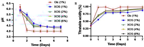 The initial pH of the fermentation medium was around 6. As shown in Figure 1, after one day of fermentation, a marked decrease in pH and a corresponding increase in titratable acidity were observed for both glucose (Glc) and XOS. The pH reached 4.1, with a free acidity of 0.99% for glucose, remaining stable until the end of the process. For XOS, the pH values ranged between 4.3 and 4.4, with free acidity values between 0.88% and 0.94% for XOS concentrations of 1%, 2%, 4%, and 6% after two days, also remaining stable until the end of the process. These glucose values were considerably (p < 0.05) lower than the XOS values at various concentrations. This result was compared with the findings of [11], who reported pH values ranging from 4.49 to 4.58 for XOS. These values fall within the tolerable range for LAB [23].