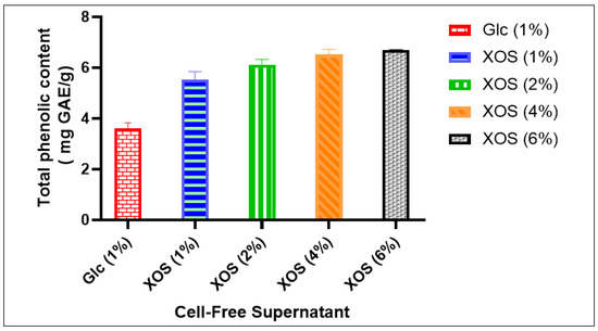 Total phenolic content (in mg GAE/g) after culture of L. plantarum S61 at 37 °C in modified MRS medium containing xylooligosaccharide (XOS: 1, 2, 4, and 6%, w/v) as a carbon source. Glucose (1%, w/v) was used as the control.