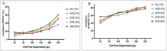 This study analyzed the antioxidant activity of CFS from XOS fermentate at different concentrations compared with 1% Glc, as shown in Figure 3A. The CFS from XOS fermentate exhibited concentration-dependent antioxidant activity. At 1, 2, 4, and 6%, the DPPH radical scavenging effect was 36.21 ± 0.7%, 49.99 ± 0.2%, 55.41 ± 0.1%, and 60.47 ± 0.4%, respectively, while it was 51.35 ± 0.2% for CFS from Glc fermentation. These results were not statistically different (p < 0.05). The highest activity, 60.47 ± 0.4%, was obtained from a concentration of 0.04 g/mL CFS from XOS fermentation. Generally, the antioxidant activity of all polymers was consistent with the concentration trend, as concluded by [30,31,32].