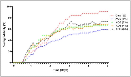 The aerobic degradation of XOS in liquid media was assessed by measuring biochemical oxygen demand (BOD) using the OxiTop® (WTW GmbH, Weilheim, Germany) closed respirometry system, adhering to ISO 14851 (1999) guidelines. Sterilized OxiTop® bottles of 500 mL capacity were filled with 97 mL of sterile MRSm medium, and then supplemented with XOS as the main carbon source at concentrations of 1%, 2%, 4%, and 6% (w/v), after filtration through a 0.45 µm sterile Millipore membrane. A 1% (v/v) overnight culture of L. plantarum S61, cultured in the same MRSm medium, was inoculated into the medium. Glucose served as the control. The cultures were incubated at 37 °C for five days, during which the OxiTop® system continuously measured oxygen levels. The collected data were then used to calculate BOD values. All tests were conducted in triplicate. Biodegradability was quantified as the volume of oxygen consumed per liter of culture medium (mg O2/L) during the degradation of carbon sources, glucose, and XOS. From the consumed oxygen volume, after making the necessary adjustments for the blank test, the percentage of the theoretical oxygen demand (ThOD) was calculated. The ThOD, defined as the mass of O2 required per mass of carbon source, was computed based on the oxygen amount necessary for the complete biodegradation of XOS, according to [16]. The net biochemical oxygen demand (net BOD) is determined by subtracting the BOD value of the blanks (BODb) from the total BOD measured for the test material (BODtm) as per Equation (1):