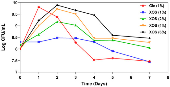 Bacterial growth increased during the first day of incubation (6.4 × 109 CFU/mL) and then gradually decreased over the subsequent days for the control (Glc). However, the growth of L. plantarum S61 increased after 2 days of fermentation in the different fermentation media containing 1%, 2%, 4%, and 6% XOS, reaching 3.0 × 108, 1.5 × 109, 5.3 × 109, and 7.77 × 109 CFU/mL, respectively. These data corroborate the findings of [40], who noticed that the quantity of L. casei on MRS control media (without XOS) grew for 12 h, remaining nearly constant until 24 h of incubation, and [41], who revealed that up to 30 h of incubation, the growth of Lactobacillus bacteria in XOS rose; following this, the total number of bacterial colonies progressively dropped until the end of 48 h of incubation (Figure 5).