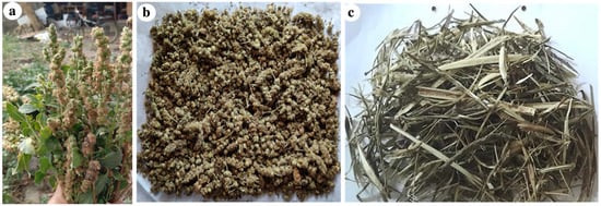 (a) Fresh inflorescences of P. benghalensis; (b) shade-dried inflorescences of P. benghalensis; (c) dried stem barks of P. benghalensis peeled off from stems.