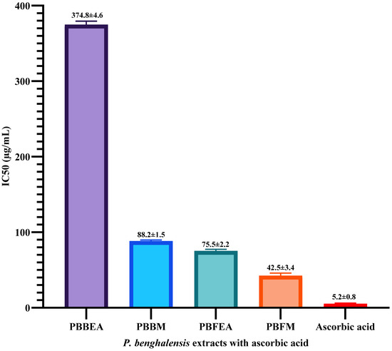 Bar chart representing the IC50 values of four distinct extracts obtained from P. benghalensis inflorescence and stem bark in terms of DPPH free radical inhibition. The chart also includes the IC50 value of ascorbic acid for comparison. Abbreviations: (PBBEA: P. benghalensis bark ethyl acetate extract; PBBM: P. benghalensis bark methanol extract; PBFEA: P. benghalensis inflorescence ethyl acetate extract; PBFM: P. benghalensis inflorescence methanol extract; AA: ascorbic acid).