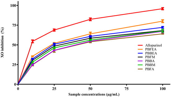 Graphical representation illustrating the inhibitory effect of ethyl acetate, methanol, and aqueous extracts of P. benghalensis inflorescence and stem bark on XO activity at different concentrations, in comparison to the standard drug allopurinol. Abbreviations: (PBFEA: P. benghalensis inflorescence ethyl acetate extract; PBBEA: P. benghalensis bark ethyl acetate extract; PBFM: P. benghalensis inflorescence methanol extract; PBBA: P. benghalensis bark aqueous extract; PBBM: P. benghalensis bark methanol extract; PBFA: P. benghalensis inflorescence aqueous extract).