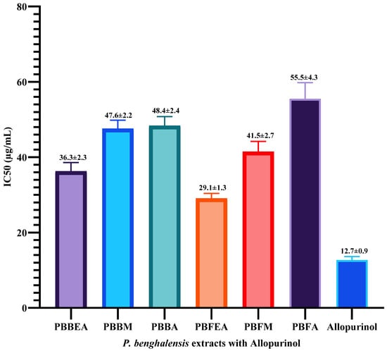 Bar graph illustrating the IC50 values of six different extracts derived from P. benghalensis inflorescence and stem bark for inhibiting xanthine oxidase enzyme activity alongside the reference drug allopurinol. Abbreviations: (PBBEA: P. benghalensis bark ethyl acetate extract; PBBM: P. benghalensis bark methanol extract; PBBA: P. benghalensis bark aqueous extract; PBFEA: P. benghalensis inflorescence ethyl acetate extract; PBFM: P. benghalensis inflorescence methanol extract; PBFA: P. benghalensis inflorescence aqueous extract).