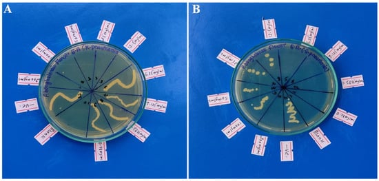 For the determination of the MBC, sterile MHA Petri dishes were prepared and activated by subjecting them to an incubation period of 45 min at a temperature of 37 °C without the presence of any bacteria. Following this step, the Petri dishes were moved to a sterile room outfitted with a dedicated laminar airflow system to ensure an uninterrupted flow of purified air. Subsequently, aliquots from each appropriately diluted test tube, which were prepared using the same methodology employed during the MIC evaluation, were inoculated onto the activated MHA plates for sub-culturing. The subcultured media were subsequently relocated to an incubator and maintained at a consistent temperature of 37 °C for a duration of 24 h. Ultimately, the MBC was established as the most minimal concentration of the plant extract sample that entirely prevented bacterial growth on the surface of the culture media [42,43].