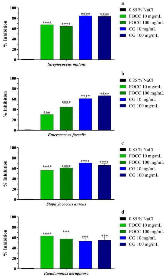 The antibiofilm activity of FOCC and chlorhexidine gluconate (CG) is detailed in Figure 2. FOCC showed promising results against both Gram-positive and Gram-negative strains, exhibiting approximately 70% inhibition of S. mutans biofilm formation at the lowest concentration tested (MIC 10 mg/mL). Regarding E. faecalis, a lesser effect was observed, with significant results only at concentrations of 100 mg/mL (MIC × 10). The MIC concentrations for S. aureus and P. aeruginosa (Gram-negative) resulted in effective inhibition of approximately 60%, similar to the action of CG at the same concentrations. Notably, against P. aeruginosa (Figure 2d), FOCC demonstrated superior inhibition compared to the reference drug.