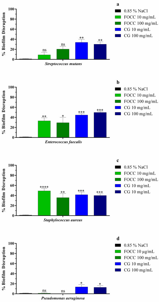 In contrast to the biofilm formation inhibition results (Figure 2), FOCC demonstrated inferior or non-significant results in pre-formed biofilm disruption, as illustrated in Figure 3. FOCC, tested at MIC and MIC × 10 concentrations, did not show clinical relevance against S. mutans and P. aeruginosa, which may suggest higher resistance, similar to the action of CG on P. aeruginosa (Figure 3d). However, for other Gram-positive strains, such as E. faecalis and S. aureus, greater pre-formed biofilm disruption efficacy was observed, even surpassing CG’s action at 10 mg/mL concentrations.
