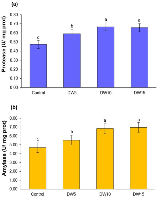 Dietary DW also significantly increased the activities of digestive enzymes, including protease, lipase, and amylase, in African catfish. This finding suggests a possible link between DW supplementation and improved feed utilization efficiency. Oni et al. [] reported that DW contains vitamin A, vitamin C, and fiber, all of which are essential nutrients for digestive enzyme activation. These enzymes play a crucial role in promoting feed digestion and nutrient absorption in fish [].