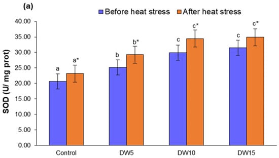 Antioxidant enzyme activities for (a) superoxide dismutase (SOD), (b) glutathione peroxidase (GPx), and (c) catalase (CAT) in the liver of African catfish fed 0% (control), 0.5%, 1%, and 1.5% dietary dill weed, before and after heat stress. DW5: 0.5% dietary dill weed; DW10: 1% dietary dill weed; DW15: 1.5% dietary dill weed. Data expressed as mean ± SD. Different letters (a–c) on each bar show significant differences (p < 0.05) among the treatments. Asterisks (*) indicate a significant effect of heat stress (p < 0.05).