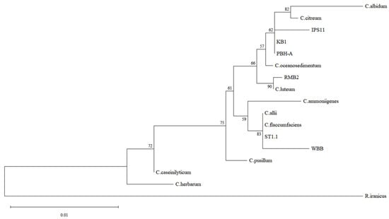 To identify the bacteria, PCR was performed to amplify the 16S rRNA gene from the isolates. Without needing genomic DNA extraction from the bacteria, culture PCR was set up by adding 5 µL of overnight tryptic soy broth (TSB) cultures to 45 µL of master mix containing 1.25 µM primers—27F (5′-AGAGTTTGATYMTGGCTCAG-3′) and 1512R (5′-ACGGCTACCTTGTTACGACTT-3′) [23,24]—and DreamTaq Green PCR Master Mix (2X) (Thermo Scientific, Waltham, MA, USA). PCR was performed using the following conditions: 95 °C—2 min; 34 cycles of (94 °C—30 s, 57 °C—30 s, 72 °C—90 s); 72 °C—7 min. PCR amplification was confirmed through agarose gel (1.5%) electrophoresis and the PCR products were purified using the Invitrogen PureLink PCR Purification Kit (Thermo Scientific), and the purified PCR samples were submitted to Azenta Inc. (South Plainfield, NJ, USA) for Sanger sequencing. The forward and reverse sequences were combined to obtain a 1.4 kb contig (Supplementary Figure S1). All six 16S rRNA contig sequences have been submitted to Genbank, and the accession numbers are IPS11, PV019085; KB1, PV019086; PBH-A, PV019087; RMB2, PV019088; ST1.1, PV019089; WBB, PV019090. The 16S rRNA sequences were used for a Nucleotide BLAST search on NCBI. To construct a phylogenetic tree, M-Coffee [25] was first used to perform a multiple sequence alignment of the six contigs with reference Curtobacterium sequences obtained from the Genbank database. The alignment was then utilized to construct a maximum likelihood tree using the Tamura–Nei model of nucleotide substitutions [26] with 500 bootstrap replications on MEGA12 software [27], with Rathayibacter iranicus as the outgroup.