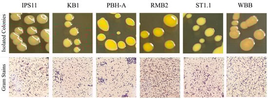 Colonies of all six Curtobacterium isolates on tryptic soy agar plates were circular to ovoid and generally flat or raised (Figure 2), which may be reflective of the obligate aerobic nature of Curtobacterium species [54], which is interesting for endophytes that appear to be living in oxygen-limiting conditions inside plant tissues. Colonies of some of the isolates were mucoid as has been reported for C. pusillum [14], which may reflect the ability of some of the isolates to synthesize water-retaining extracellular polysaccharides (EPSs), possibly using sugars from the medium.