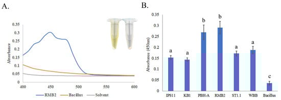 All Curtobacterium isolates, except IPS11, which generally produced pale yellow colonies, and WBB, which produced orange colonies, were characterized by vibrant yellow colonies (Figure 2 and Figure 3). A spectral scan of the extract of a representative isolate, RMB2, revealed a peak with an absorption maximum at 450 nm, which was absent in the non-pigmented control Bacillus species (Figure 3). Relatively high absorption at 450 nm was observed in all Curtobacterium isolates, suggestive of a potential carotenoid peak that could contribute to the yellow/orange coloration of the isolates.