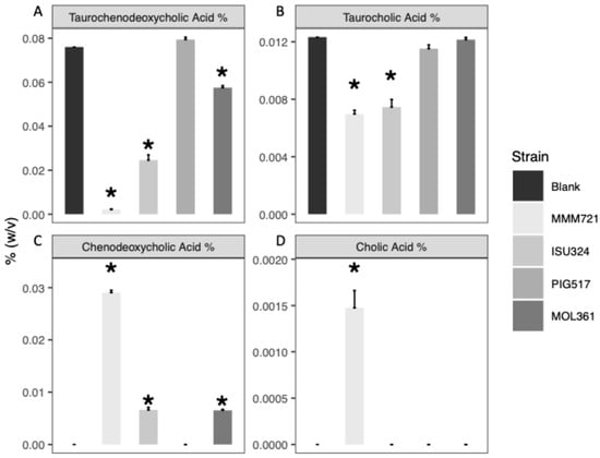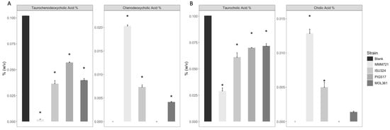 - Foley, M.H.; O’Flaherty, S.; Allen, G.; Rivera, A.J.; Stewart, A.K.; Barrangou, R.; Theriot, C.M. Lactobacillus bile salt hydrolase substrate specificity governs bacterial fitness and host colonization. Proc. Natl. Acad. Sci. USA 2021, 118, e2017709118. [Google Scholar] [CrossRef] [PubMed]