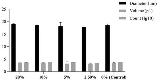 Based on measurements performed in triplicate (Supplementary Data S1), the average diameter of control cells was 18.52 µm. The 2.5% group had an average of 17.80 µm, the 5% group had an average of 18.0 µm, the 10% group had an average of 18.51 µm, and the 20% group had an average of 18.95 µm (Figure 3). These data cannot be regarded as an indicator of cell health due to the small differences, and it is therefore inconclusive whether they can serve as a reference of RTGill-W1 size range. However, the fact that the size showed a correlation with the metabolic rate is suggestive of a biologic effect. The assay is useful for studying metabolic function as well as cell health [,].