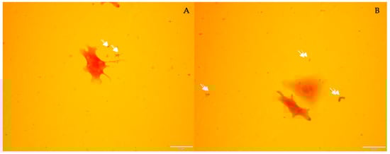 Two photos (A,B) of S. enterica-inoculated RTGill-W1 culture rinsed with PBS after 2 h of incubation. Bacteria are indicated by white arrows. Images captured at 200× magnification.
