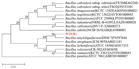 The PCR product was purified, and Sanger sequencing was performed by Sangon Biotech (Shanghai, China). The obtained sequence was assembled and edited to obtain a consensus sequence. This consensus 16S rRNA gene sequence was deposited in the NCBI GenBank database under the accession number PX460989. The obtained sequence was analyzed by BLASTn 2.17.1 comparison against the NCBI nucleotide database (http://www.ncbi.nlm.nih.gov; accessed on 1 August 2025). To construct a reliable phylogenetic tree, the 16S rRNA gene sequence of strain W10-B1 was aligned with corresponding sequences from closely related Bacillus type strains, retrieved from the NCBI Nucleotide database. The selection criterion was that all reference sequences must be derived from the type strains of validly published species. Multiple sequence alignment was performed using the ClustalW algorithm integrated in MEGA software (version 4.1). The phylogenetic tree was inferred using the neighbor-joining method with bootstrap analysis based on 1000 replicates to assess the robustness of the tree topology.