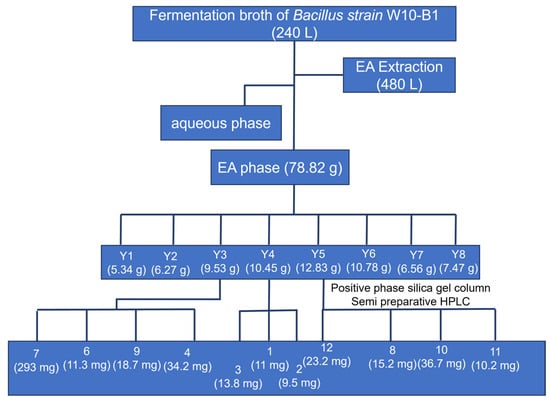 For large-scale compound production, the fermentation was carried out in multiple batches. Bacillus strain W10-B1 was cultivated using the method described above, with each batch consisting of a 2 L Erlenmeyer flask containing 1 L of TSB medium. Specifically, a total of 240 individual 1-L batches were processed.