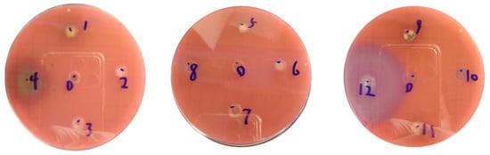 Screening against S. marcescens NJ01 (Figure 4) led to the identification of two active compounds. Compound 12 (3,3′-dibromo-4,4′-biphenyldiol) exhibited significant anti-quorum-sensing activity, as evidenced by a distinct decolorized zone. In contrast, compound 4 produced a clear inhibition zone, indicating potent antibacterial activity. The other tested compounds showed no significant activity compared to the DMSO control.