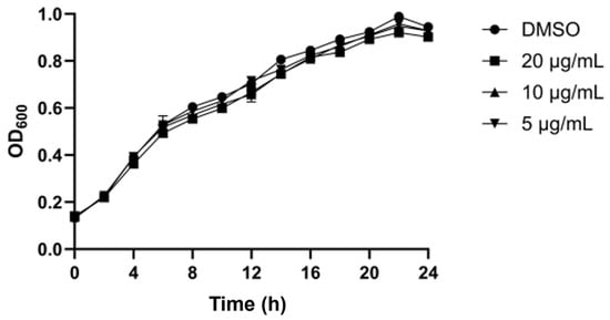 3,3′-Dibromo-4,4′-biphenyldiol, at concentrations ranging from 5 to 20 μg/mL, did not significantly inhibit the growth of S. marcescens NJ01 (Figure 5). Therefore, this concentration range was deemed suitable for assessing its specific QSI activity against the bacterium. The observation that bacterial growth was largely unaffected at these sub-inhibitory concentrations (below 20 μg/mL) is consistent with the characteristic profile of a classic quorum-sensing inhibitor.