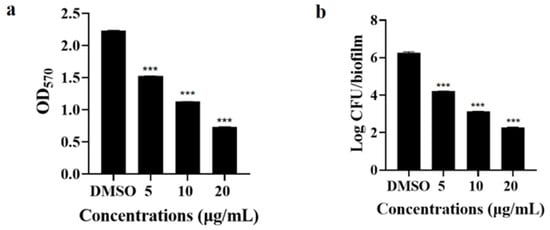 Inhibition of S. marcescens NJ01 biofilm by 3,3′-dibromo-4,4′-biphenyldiol: (a) Biofilm biomass measured with crystal violet staining. (b) Viable cell count within the biofilm. Data are shown as mean ± SD (n = 6). *** p < 0.001 vs. DMSO control (one-way ANOVA with Tukey–Kramer test).