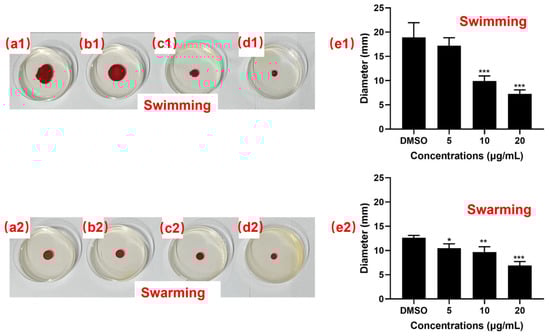 Effect of Compound 12 on the swimming and swarming motilities of S. marcescens NJ01. Panels from left to right show (a1,a2) DMSO control, (b1,b2) 5 μg/mL, (c1,c2) 10 μg/mL, (d1,d2) 20 μg/mL of Compound 12, and (e1,e2) Quantification of motility zone diameters. The diameters of the swimming and swarming zones were measured and are presented as mean ± SD from three independent experiments. *** p < 0.001, ** p < 0.01, * p < 0.05 vs. DMSO control (one-way ANOVA with Tukey–Kramer test).
