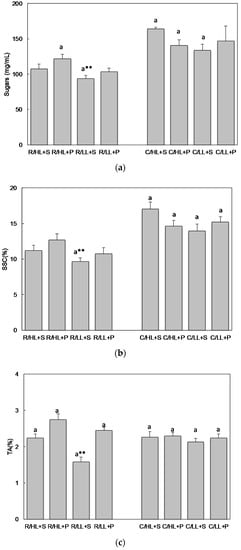 Raspberry is considered as a low energy fruit that is comprised primarily of natural carbohydrates, with the main sugar form being fructose, a feature that makes berry fruit very popular among consumers. The effect of light conditions in relation to the substrate on total sugar concentrations is shown in Figure 2a. ‘Ruvi’ plants produced fruits that contained less sugars compared to ‘Cayuga’ under all test conditions. The lowest values were obtained for ‘Ruvi’ plants grown under LL and soil conditions. No statistically significant change in sugar concentration was observed in Cayuga.