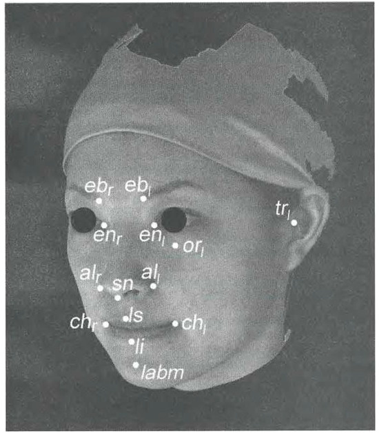 Reference points of the perioral soft tissue (ebr: Eyebrow right; ebI: Eyebrow left; enr: Entocanthion right; enI: Entocanthion left; air: Alare right; all: Alare left; sn: Subnasale; orI: Orbitale left; trI: Tragion left; chr: Cheilion right; chI: Cheilion left; ls: Labral superiors; li: Labral inferiors; lamb: Labiodental).