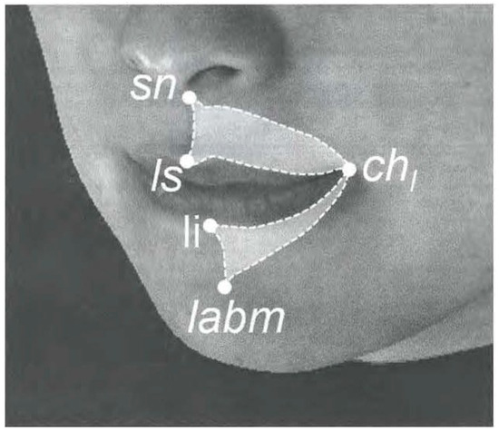 Area variables for perioral soft tissue (sn: Subnasale; ls: Labral superiors; li: Labral inferiors; chI: Cheilion left; lamb: Labiodental).
