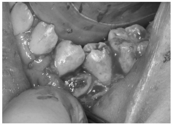 Condition of the target tooth during oral surgery. The target tooth was visible after removal of the oral mucosa, and the tooth was divided into two parts and extracted.