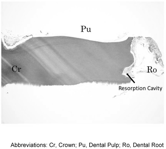 - Takeda, Y.; Yahata, C. Histologic study of submerged deciduous teeth with marked ankylosis in a case of congenital missing permanent teeth. The Japanese Journal of Pediatric Dentistry 1982, 20, 264–270, [In Japanese]. [Google Scholar]