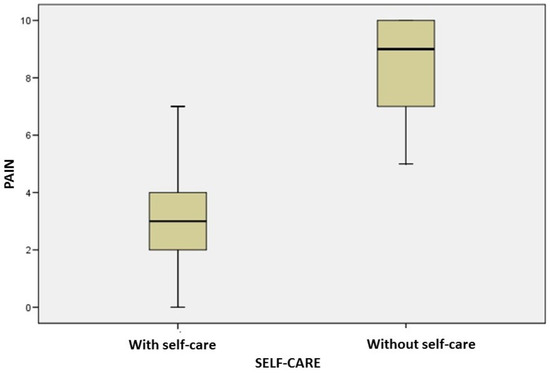 The difference between pre and post pain self-care was statistically significant (p <0.001). Table 1 presents data indicating the change in pain levels between the two times of measurement in the G1 group according to VAS. The self-care group was statistically significant in relation to Mann Whitney test (p <0.001), unlike the group that did not receive the self-care guides (p> 0.001). The difference between these medians is shown in Figure 1. Regarding the patients in the control group (G2), because they did not receive the self-care guidelines, their pain sensations remained the same as those measured on the first day through VAS, as shown in Table 2.