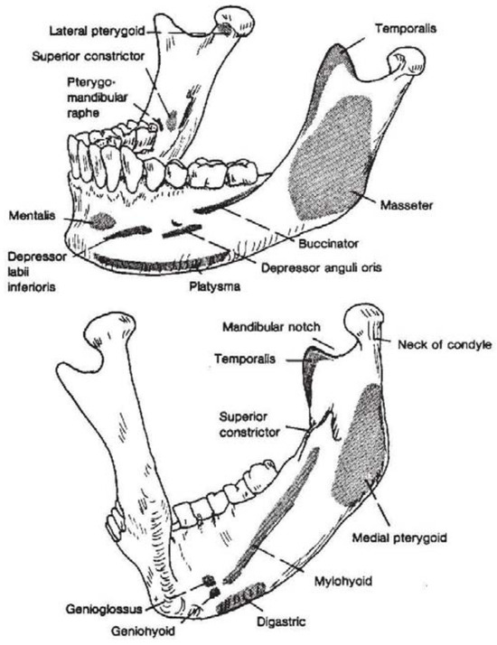 The mandible, showing its muscular attachments. Note the masseter and medial pterygoid attachments on each side of the mandible at the angle and distal body of the mandible. (From Bateman, H.E., and Mason, R.M.: Applied Anatomy and Physiology of the Speech and Hearing Mechanism, 1984. Courtesy of Charles C. Thomas, Publisher, Springfield, Illinois.).