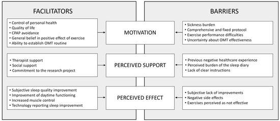 A total of 10 patients (P1–P10) were interviewed. Interviews lasted approximately 30–80 min. The analysis revealed an overarching theme centered on the barriers and facilitators influencing adherence to OMT, organized into three main themes: (1) motivation, (2) perceived support, and (3) perceived effect. This overarching theme captured participants’ experiences throughout the 12-week OMT program, shedding light on the complexity of the factors that impacted their commitment and engagement with the OMT intervention process. Detailed overview of facilitators and barriers to OMT is presented in Figure 1.
