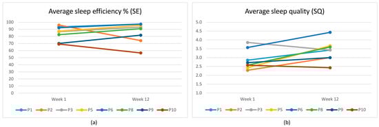 The participants also registered their sleep in the diary, in which they calculated and reported total sleep time, sleep efficiency (SE), and sleep quality (SQ). SE was calculated as total sleep time divided by the duration of the sleep episode, following the method proposed by Reed and Sacco 2016 [20]. Participants’ perceived SQ was reported using a 5-point Likert scale (1 = very poor; 5 = very good). This sleep data was visualized in the diary.