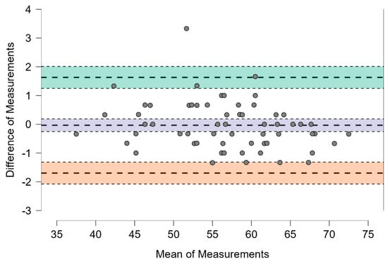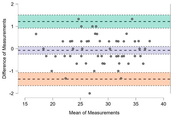 The Bland–Altman analysis was conducted to assess the level of agreement between the Sandway® and the IOPI® devices in the measurement of tongue strength. The mean difference (bias) between the two instruments was −0.034 kPa, with a 95% confidence interval ranging from −0.253 to 0.186, indicating minimal systematic bias. The limits of agreement, calculated as the mean difference ± 1.96 standard deviations, extended from −1.698 kPa (95% CI: −2.078 to −1.318) to 1.631 kPa (95% CI: 1.251 to 2.011) (Table 4 and Figure 2). Importantly, no trend toward proportional bias was observed in the Bland–Altman plot, suggesting that the level of agreement remained consistent across the spectrum of measured values. Overall, these findings support a strong level of agreement between the Sandway® and the IOPI® for tongue pressure measurement.